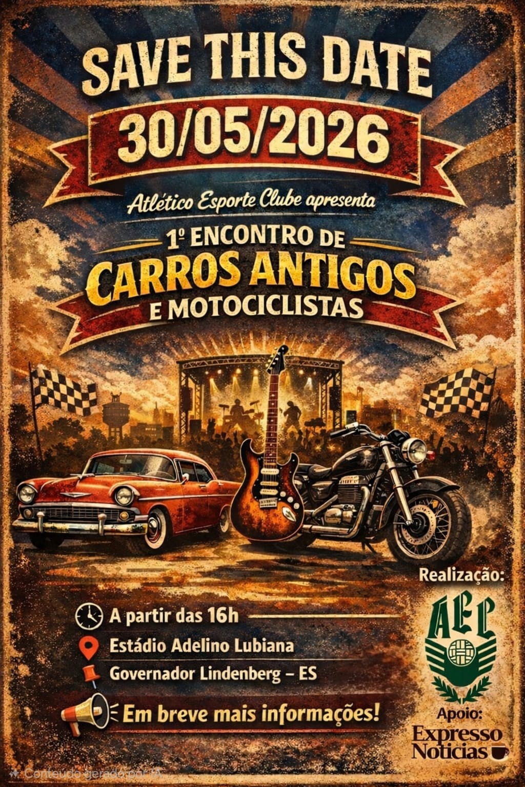 O Atlético Esporte Clube anunciou a realização do 1º Encontro de Carros Antigos e Motociclistas, que acontecerá no dia 30 de maio de 2026, em Governador Lindenberg.