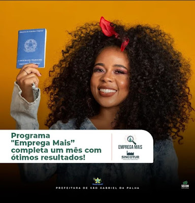 No mês de junho foi lançado o Emprega Mais, programa da Secretaria do Trabalho, Desenvolvimento Econômico, Indústria, Comércio e Turismo de São Gabriel da Palha – SINCOTUR, com objetivo de recrutar mão de obra para as empresas da Cidade. Ao todo, foram divulgadas 242 vagas de empregos, do comércio e das indústrias, com salários entre R$ 1.100,00 a R$ 4.000,00.